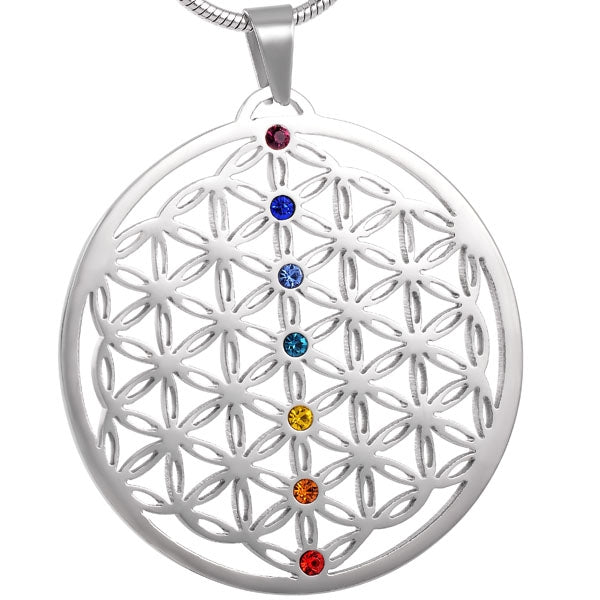 Blume des Lebens mit sieben Zirkonia in den Chakrenfarben